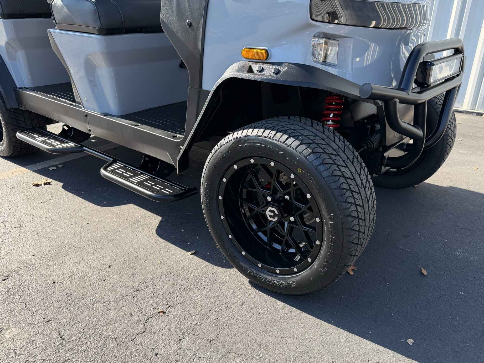 The Rover XL is equipped with four-wheel hydraulic brakes, integrated turn signals, and a rearview mirror. The vehicle also includes a brush guard with an LED light bar, running boards, and side mirrors with turn signal indicators.