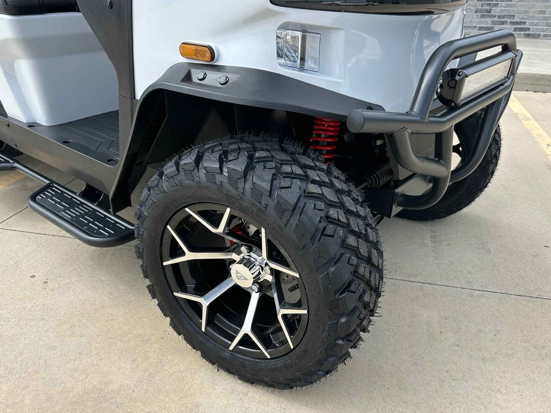 The Rover XL is equipped with four-wheel hydraulic brakes, integrated turn signals, and a rearview mirror. The vehicle also includes a brush guard with an LED light bar, running boards, and side mirrors with turn signal indicators.